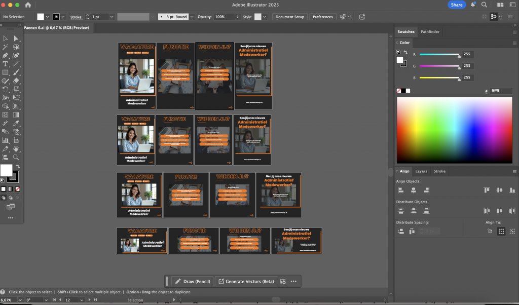 Deze opdracht bevestigde dat ik flexibel kan omgaan met nieuwe merken, formats en creatieve ideeën. Door te experimenteren en feedback snel toe te passen, kon ik effectief meebewegen met de wensen van collega’s en opdrachtgever. Bovendien heb ik nieuwe technieken in Adobe Illustrator geleerd die ik ook in toekomstige visuele opdrachten kan inzetten.