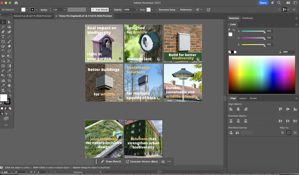 Mijn taak was om Google Display-visuals te ontwerpen die passen bij de huisstijl en tone of voice van Vivara Pro en die visueel sterk genoeg zijn om op te vallen binnen online campagnes. Ik ontwierp visuals voor zowel de Duitse als de Engelse markt, elk met een eigen B2B-doelstelling. Voor Duitsland lag de focus op het communiceren van biodiversiteit en milieuvriendelijke wildleven-nesten die Vivara Pro aanbiedt, terwijl voor Engeland de nadruk lag op urban biodiversity en nature-inclusive oplossingen. Daarbij moest ik openstaan voor nieuwe creatieve ideeën en feedback.