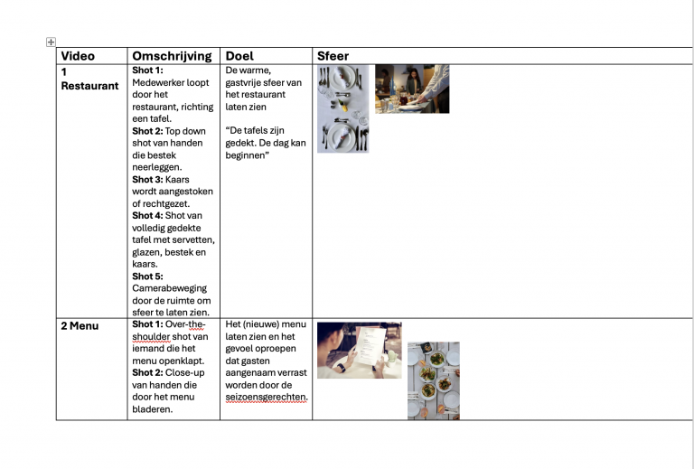 Ik heb bruikbare shotlists opgeleverd voor Jolron, Laserstudio Venray en Gasterie Lieve Hemel, inclusief visuele voorbeelden en productlijsten. De ideeën werden steeds concreter en beter afgestemd op het doel en de doelgroep. Bij Gasterie Lieve Hemel mocht ik daarnaast aanwezig zijn bij het filmen.