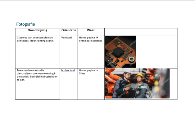 Mijn taak was om shotlists te ontwikkelen die aansluiten bij de stijl, tone of voice en boodschap van de organisatie. Daarnaast moest ik visuele inspiratie toevoegen, een productlijst maken met wat er nodig was voor de shoot en een tijdschema opstellen.